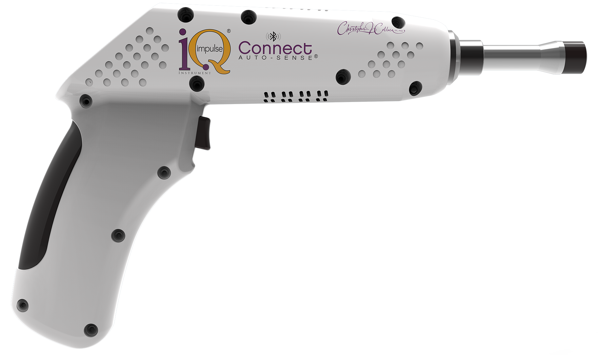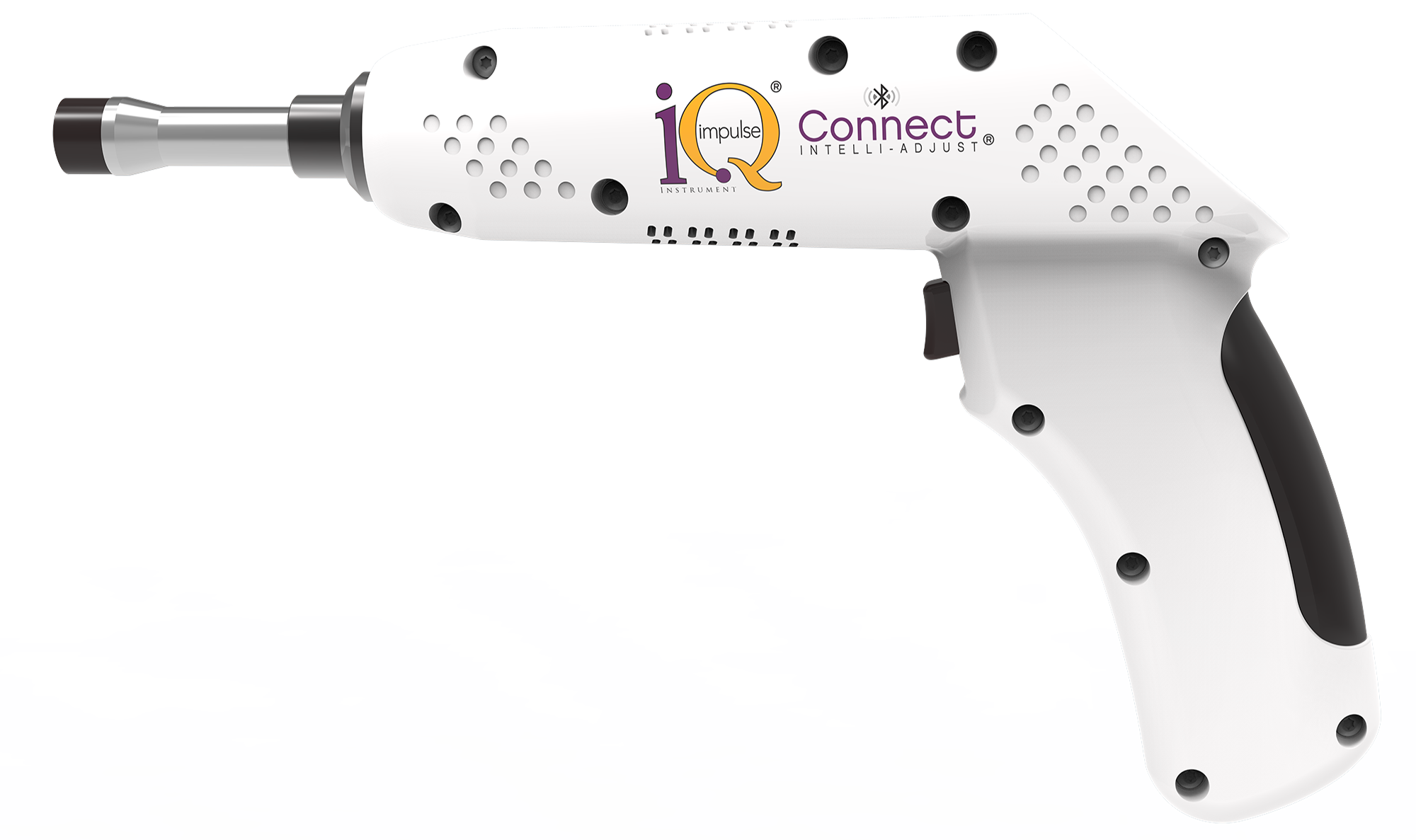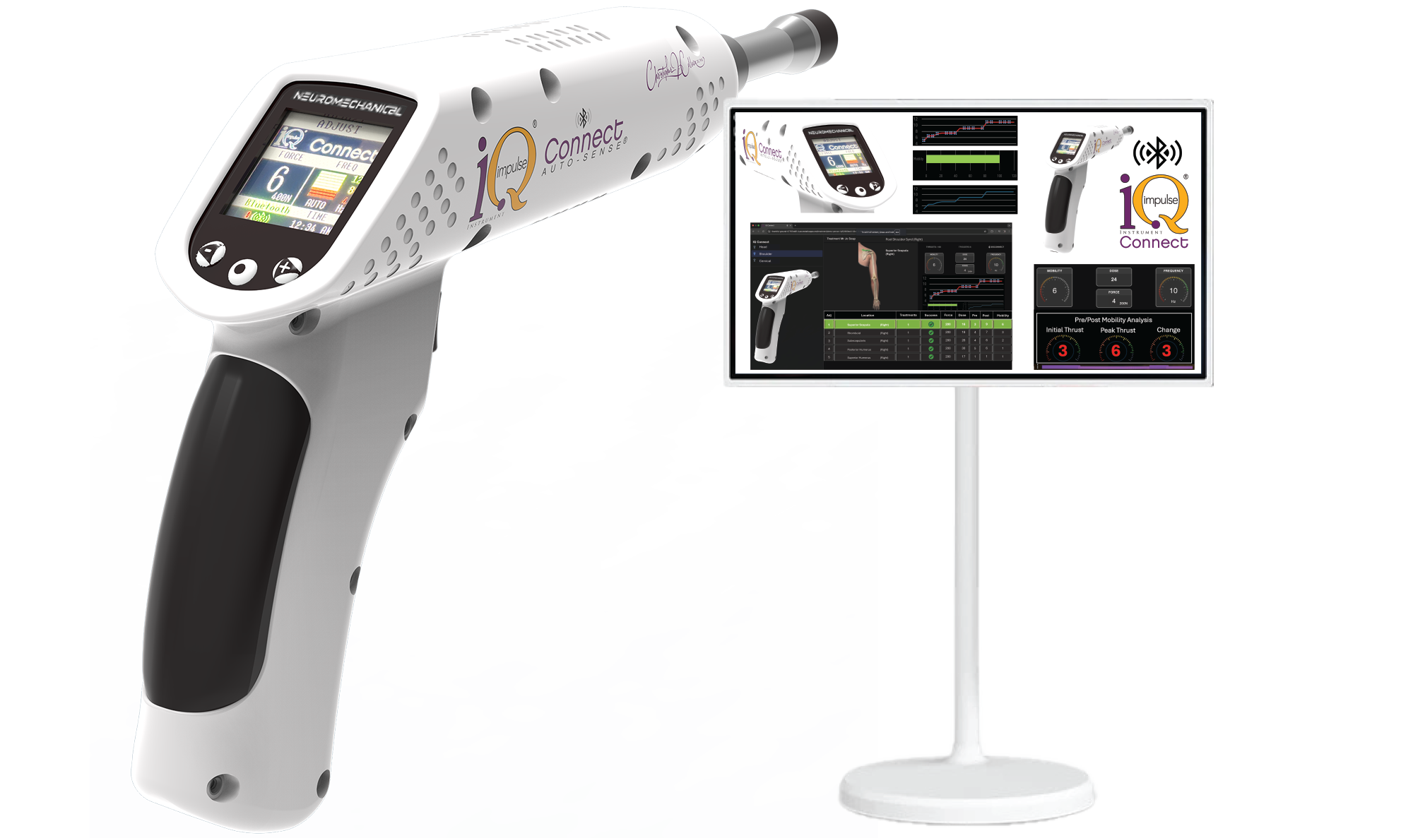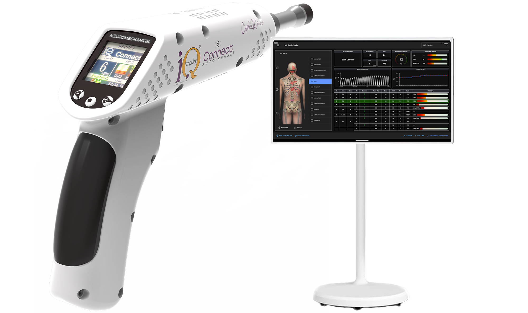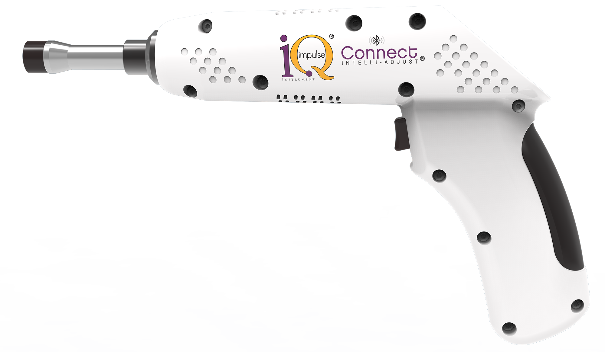 • Impulse IQ Connect has Neuromechanical patented Auto-Sense® and Intelli-Adjust® technologies that detect and analyze spinal motion during each thrust. Neuromechanical AI technology and validated sensors recalibrate each subsequent trust to precisely match the speed of the moving joint. “Adjust to the frequency®” is what we call it – maximizing joint mobility with the least amount of adjusting is what it is!